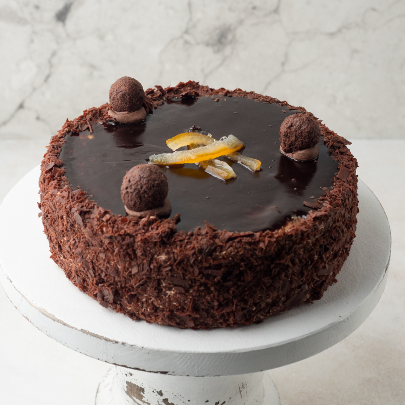 шоколадный бисквит, сироп с коньяком, шоколадный 	крем с яркой апельсиновой ноткой